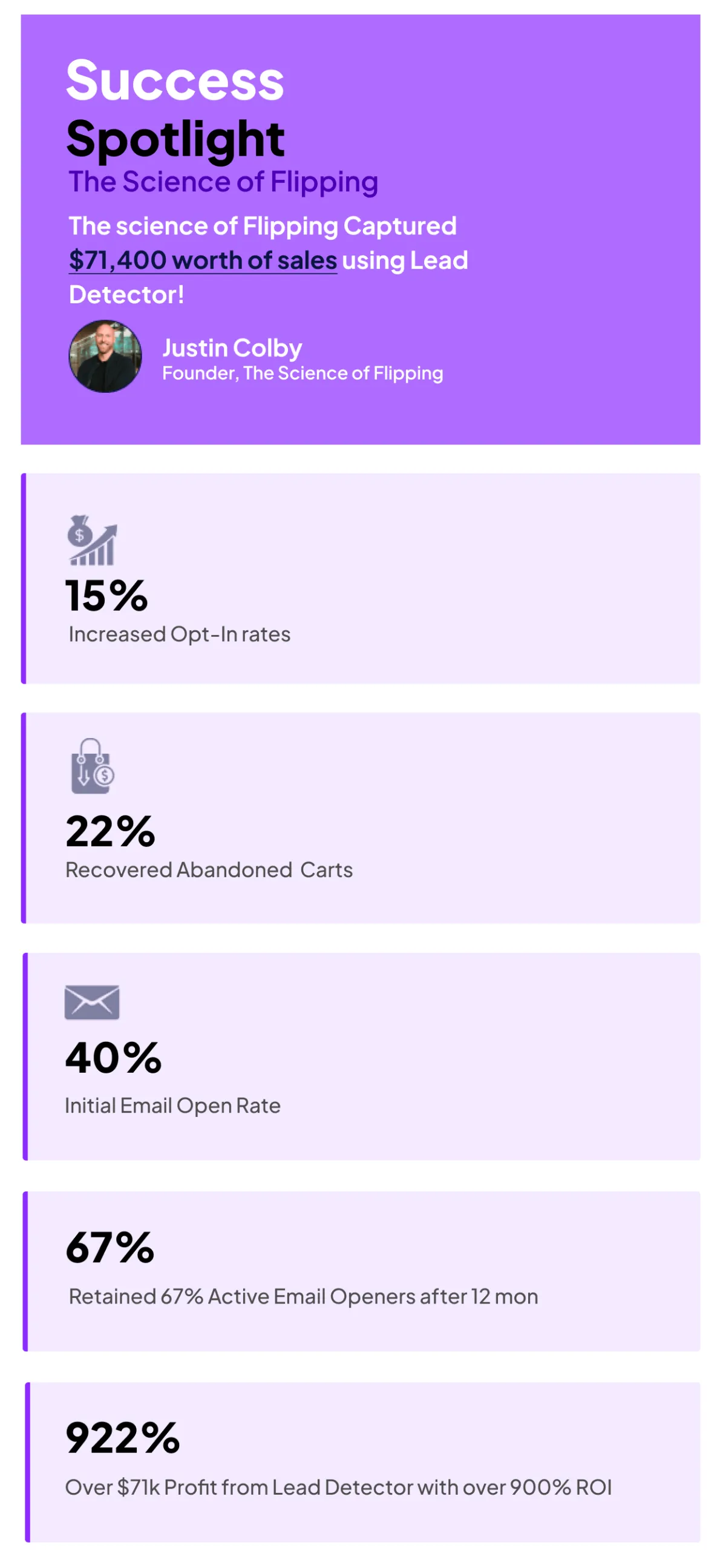 I've been using Lead Detector on all of our websites and landing pages for the last 12 months and we consistently grow our email marketing list by 20% each month from Lead Detector alone which has led to over $70k worth of sales!